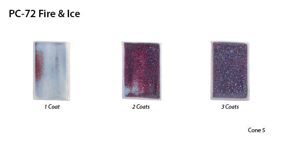 PC-72 Fire & Ice is deep red where thick and icy blue where thin. Fire & Ice is a reduction copper red for electric firing with a dramatic icy blue-colored break on texture. Apply three coats for best oxblood red color.